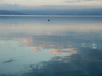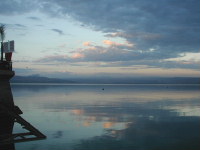 | ホテルに帰ると薄いピンク色に焼けた空と雲がきれいでした。ガリラヤ湖にそれが写ってました。 |
