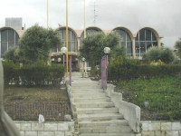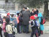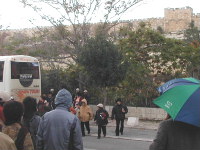 旧市街を出ました。見晴らしの良いレストランで昼食をとり、いよいよオリーブ山ヘ。途中、団体で帰る小学生たちでしょうか?が見えました。とするとこれは学校? |