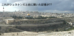 | 余談ですが、高層ビル群からちょっとはずれた所にぽつんとある建物がシェラトンホテルだったような気がします(翌日ホテルの部屋からオリーブ山のセブンアーチスホテルらしきが見えました)。 |