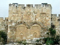 | オリーブ山側に来ると黄金門が見えます。オリーブ山の上のセブンアーチスホテルの前にバスが停まりました。 |