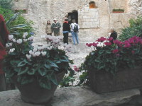| ゲッセマネの園のそばまでオリーブ山をバスで下ってきました。ちょうど黄金門が見える位置でバスを降りました。ゲッセマネの園に入ると正面上方に黄金門が見えました。説明を聞いた後に、黙想の時がもたれました。 |