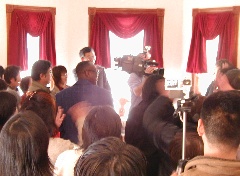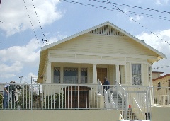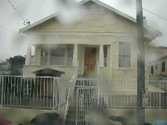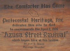 2回目の午後、玄関前でマイクもった黒人さんと撮影中のカメラマンの姿がありました。/木の看板に「1906年4月9日」の日付けと「アズサ街リバイバル」の文字がありました!(後で写真を見て気付いたので主の恵みです) |