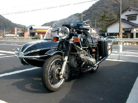 インターを降りて、しばらくいくと道の駅?のようなものがあったのでとりあえずそこで休憩。するとえらいシブイ 側車付きのBMWが。車種はR90/6。R100ではなくR90であるところがシブいっ!オーナーの方 と少しお話をさせていただくと、もう20年!ほど乗っていらっしゃるとか。オーナー氏も中古で買われたそうな。これから琵琶湖で行われるサイドカー のオーナーズミーティングに向かわれる途中だそうだ。お互いの安全を願ってお別れする(なぜか名刺をいただきました(^^;;;;; )。