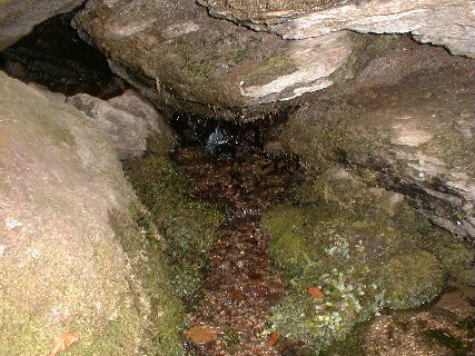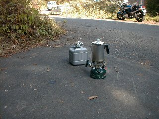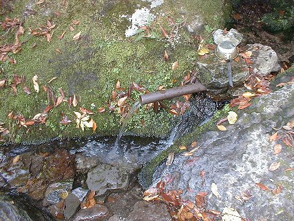 入り口から少しハイクして湧水地へ向かう。こんな感じの美しい沢の横を 300mほどハイクしていくと湧水地に到着。湧水地はこんな感じになっていて、水が汲みやすいように こんな感じになっている。ここでパーコレータに水を汲んで、コーヒーを沸かしはじめた。 やっぱりよい水で沸かしたコーヒーはウンマイ(ウルトラアメリカンではあったが(^^;;;;; )。