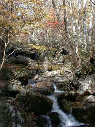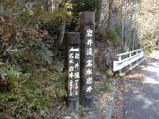 恩原高原スキー場の横を通り過ぎ、湧水地へ向かう細い道へ。道には晩秋を感じさせる落ち葉が一杯でこれはこれで風情があるのだが、 こちらとしてはいやな思い出が頭を過ぎる(笑)。どんどん道が細くなっていくのでたどり着けるのかという不安と戻ってこれるのかという不安が 頭の中をグルグル。しかしそれは杞憂に終わり、湧水地入り口まで道は舗装されていた。