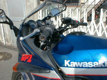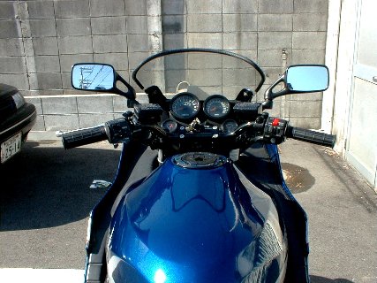 先週たちゴケたところを見てみる。カウルに傷が入り、塗装がはげた程度。ズルズル行かなかったので削れなかったようだ。 後は右ステップがポッキリと折れている。よかった。軽症じゃん。そそくさと、ステップを交換する。NORIさんから、「トップブリッジのカバー、付けた方がかっちょいいよ」 と指摘をうけたので、そりゃそうだということでいそいそとハンドルバー・ブラケットをはずして装着。ブレーキフルードがリザーブタンクから少しにじんでいる。 うーん、やっぱ別体式に替えた方がいいかなぁ。まぁも少し様子を見てみよう。バーエンドを付ける。デザインよりも機能優先で結構重めのヤツを選んだ。 アップハンのポジションに慣れるため距離にして約100kmほど走行。ハンドルもフワフワしたような変な感覚がずいぶんマシになった。やっぱラクチンっす〜。ヽ(^o^)ノ