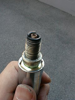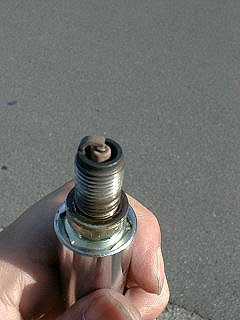 MJ #145エンジンをかけてみたところ、スパっと一発で始動。 が、すでにエンジンがあたたまってしまっているので良否判断不可。 極低速で自宅の回りを2Kmほど走ってみて具合を見る。低速の具合がよくなったような気がする。 明らかにベクトルはよい方向へ向いている。ちなみにその走行後のプラグはこんな感じ。