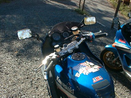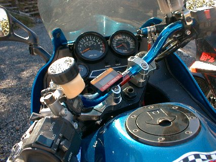 98年の全国ミーティングでは、ストックのハンドルであったが今年からアップハン化されている。ブレーキマスタはCBR900RR用。 クラッチはニッシン製のものをデイトナが販売しているものを使用。ボッシュ製のデジタル油温計をセット。ウィンカー・ハザードスイッチ部 は、GPZ400RD3用を配線加工して流用。 |