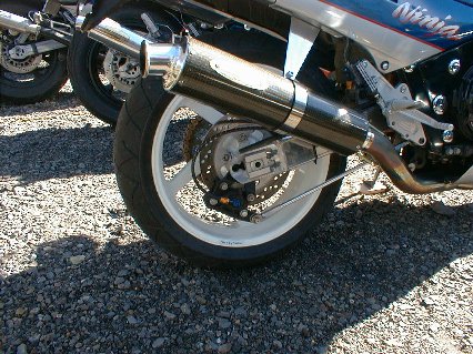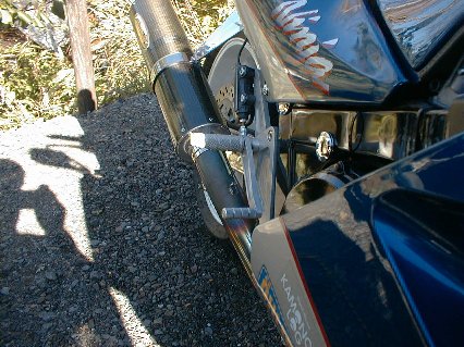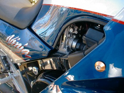 リヤ周りでは、兵庫県尼崎のアドバンテージがワンオフしたスイングアームが目を引く。80X32の目の字断面材を使用し、 剛性はかなり高くしっかり腰のある感じとのこと。価格の公表はできないが、アッパーカウル+L・Rサイドカウル の新品の値段と同じくらい(笑)。また、型を起こしたらしく再作成に応じることができるとのこと。サスはオーリンズが セットされている。ホイールは、こちらもマルケのマグでサイズは5.5X17。キャリパはF同様、apロッキードが セット。タイヤサイズは、ミシュランTX25の180/55−17。エグゾーストは、ツキギのエキパイにテックサーフの カーボンサイレンサーがセットされる。 |